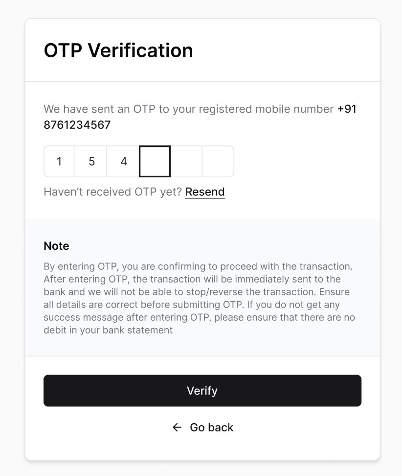 - The user completes the 2FA OTP verification sent by the bank to add the beneficiary.