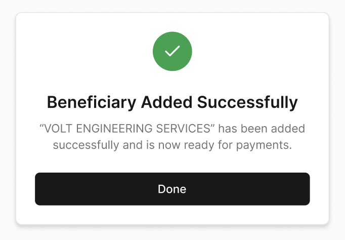 Add New BeneficiaryAPI with the merchant’s username (email ID or mobile number) and the beneficiary’s bank account/vendor details. - Open validates the username and returns a redirect URL with a one-time session token.
