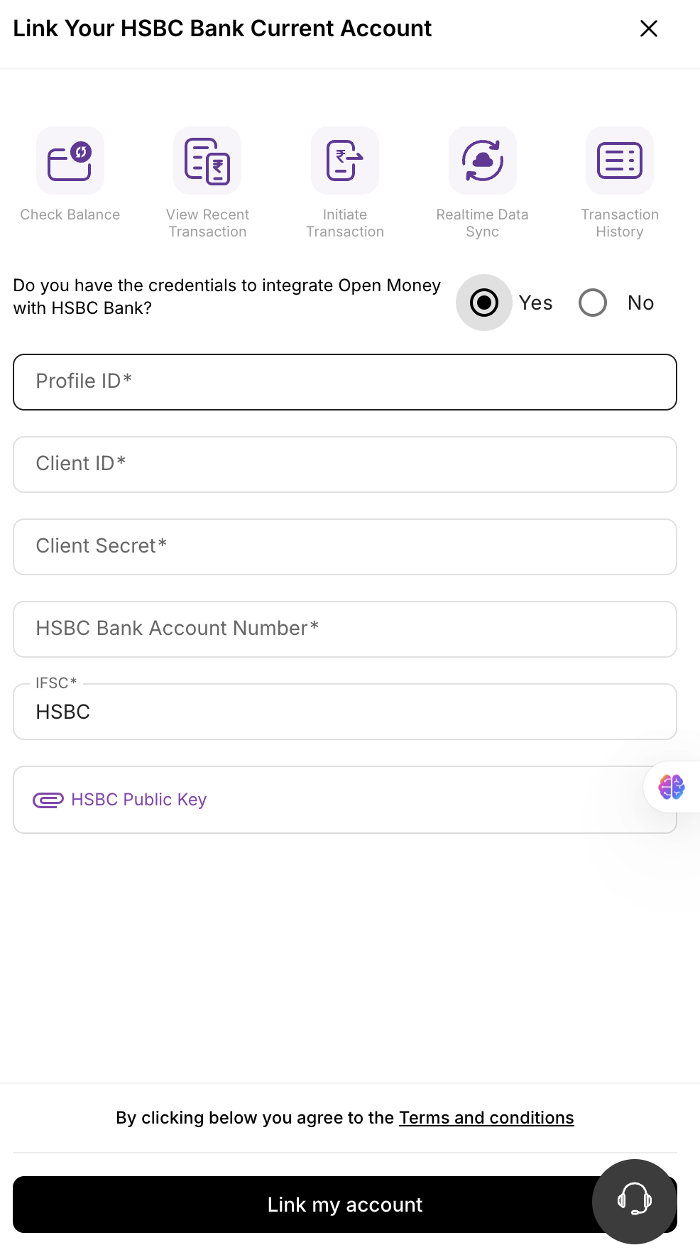 After Open configures and verifies the credentials, the HSBC account linking option will become available in your company’s Open Dashboard.